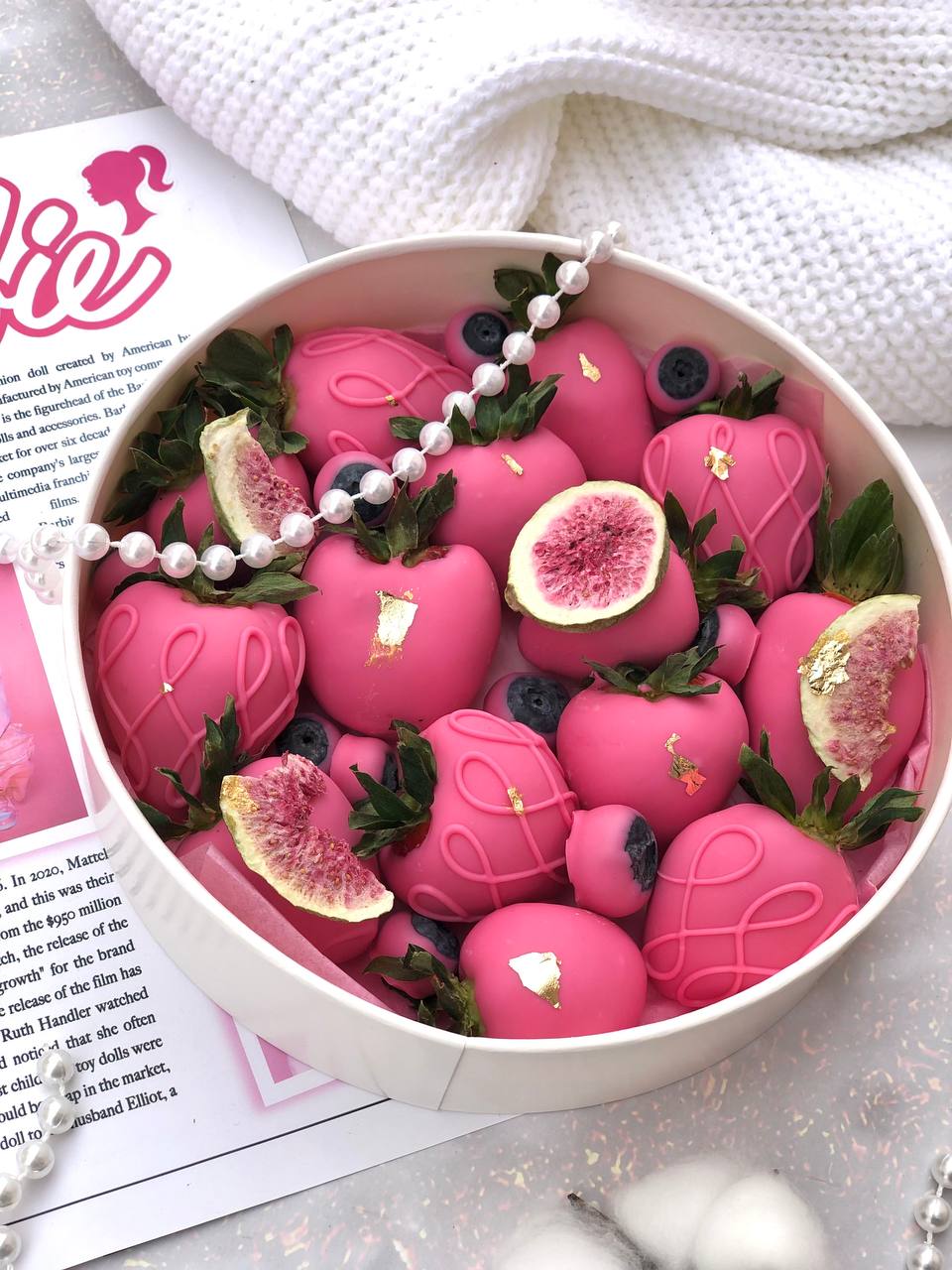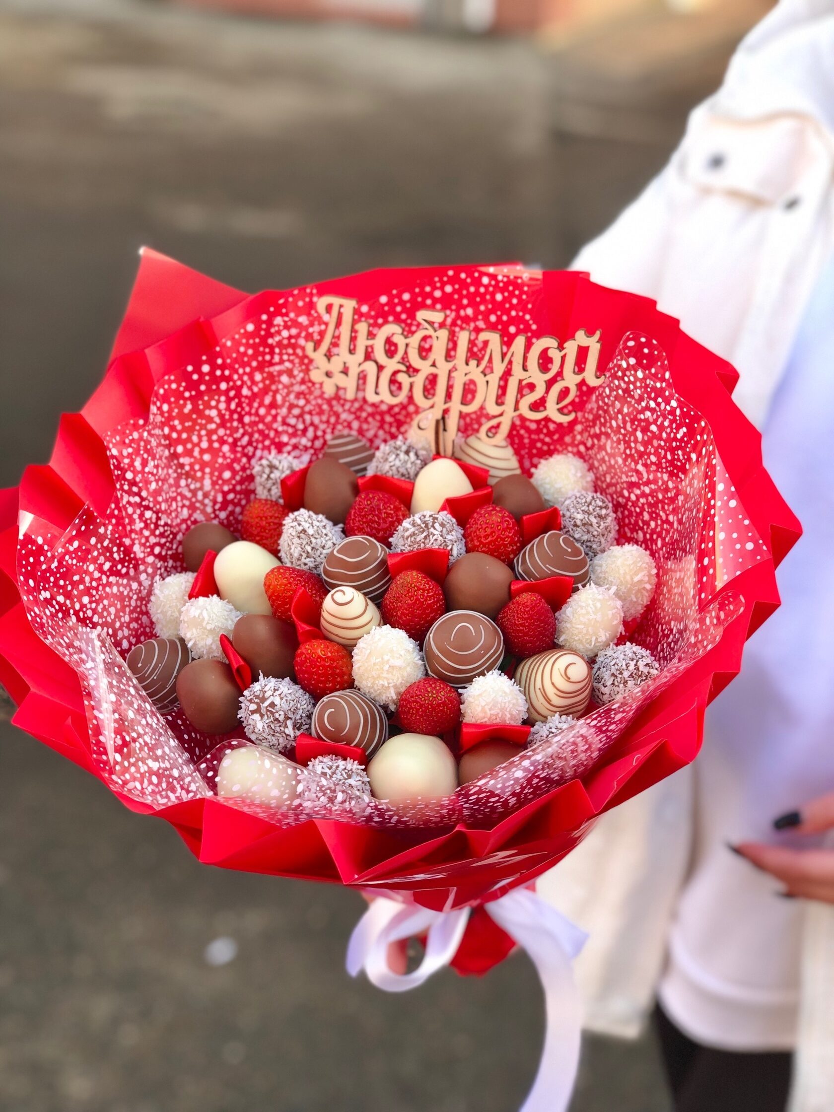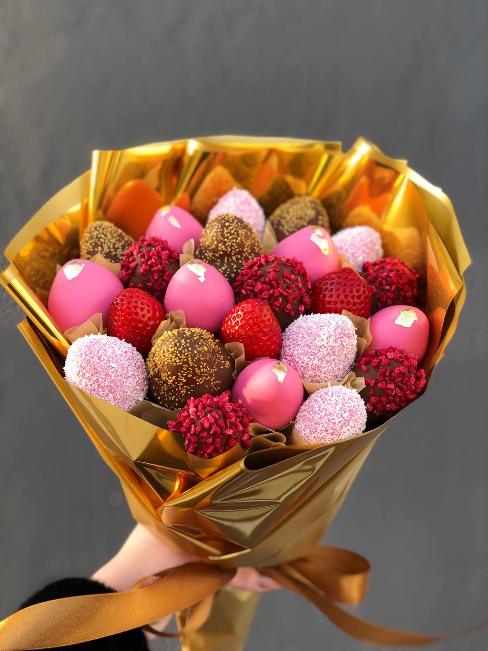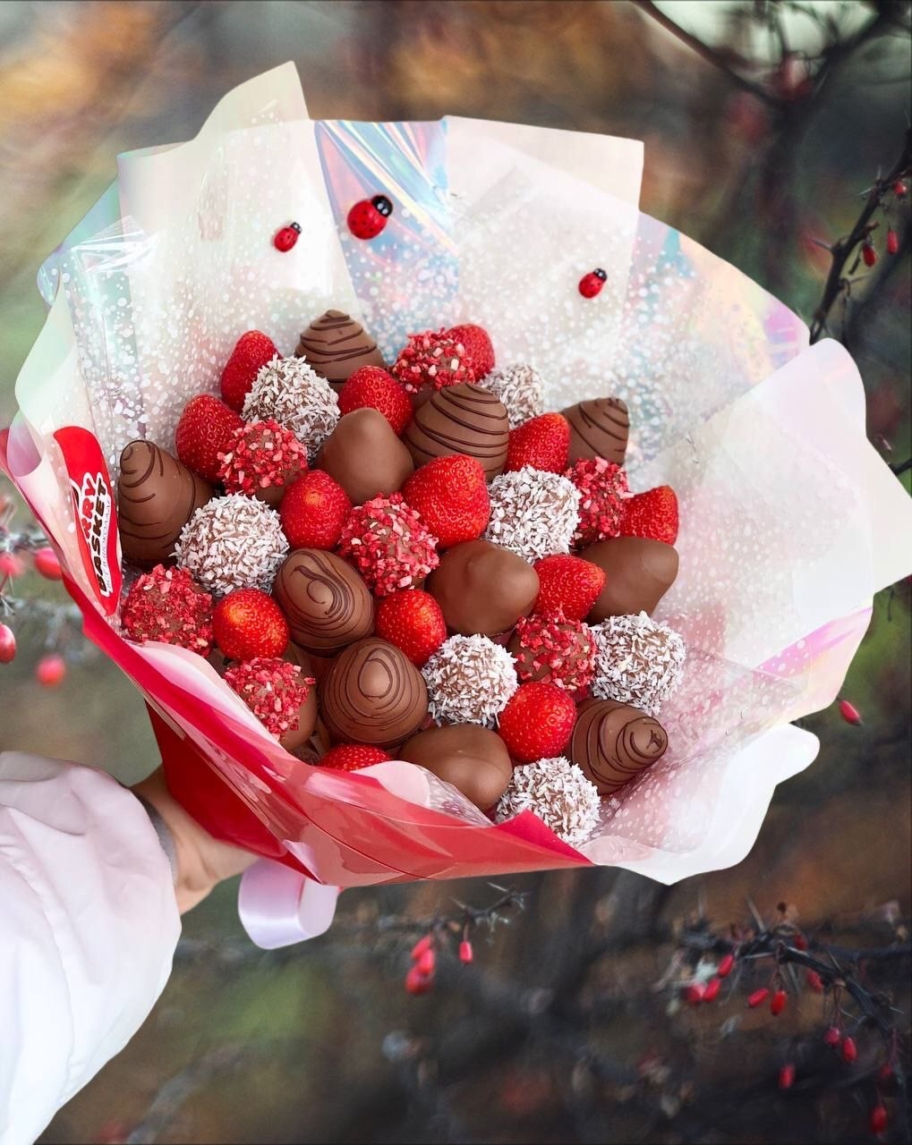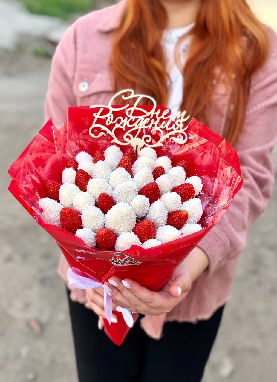 Съедобный букет из клубника в шоколаде Состав: Свежая клубника, бельгийский белый и молочный шоколад, кокосовая стружка, сублимированная малина, золотистый сахар.