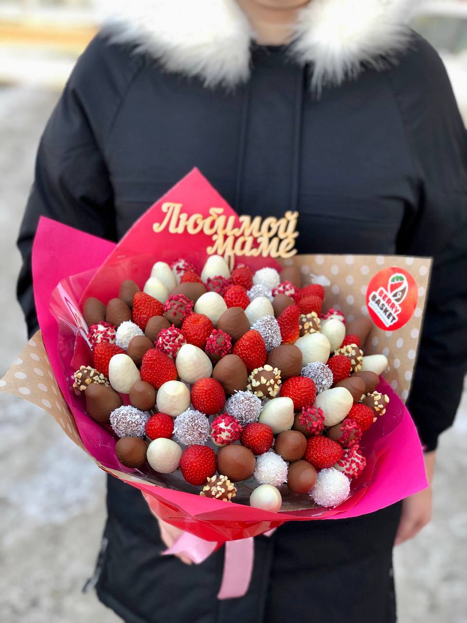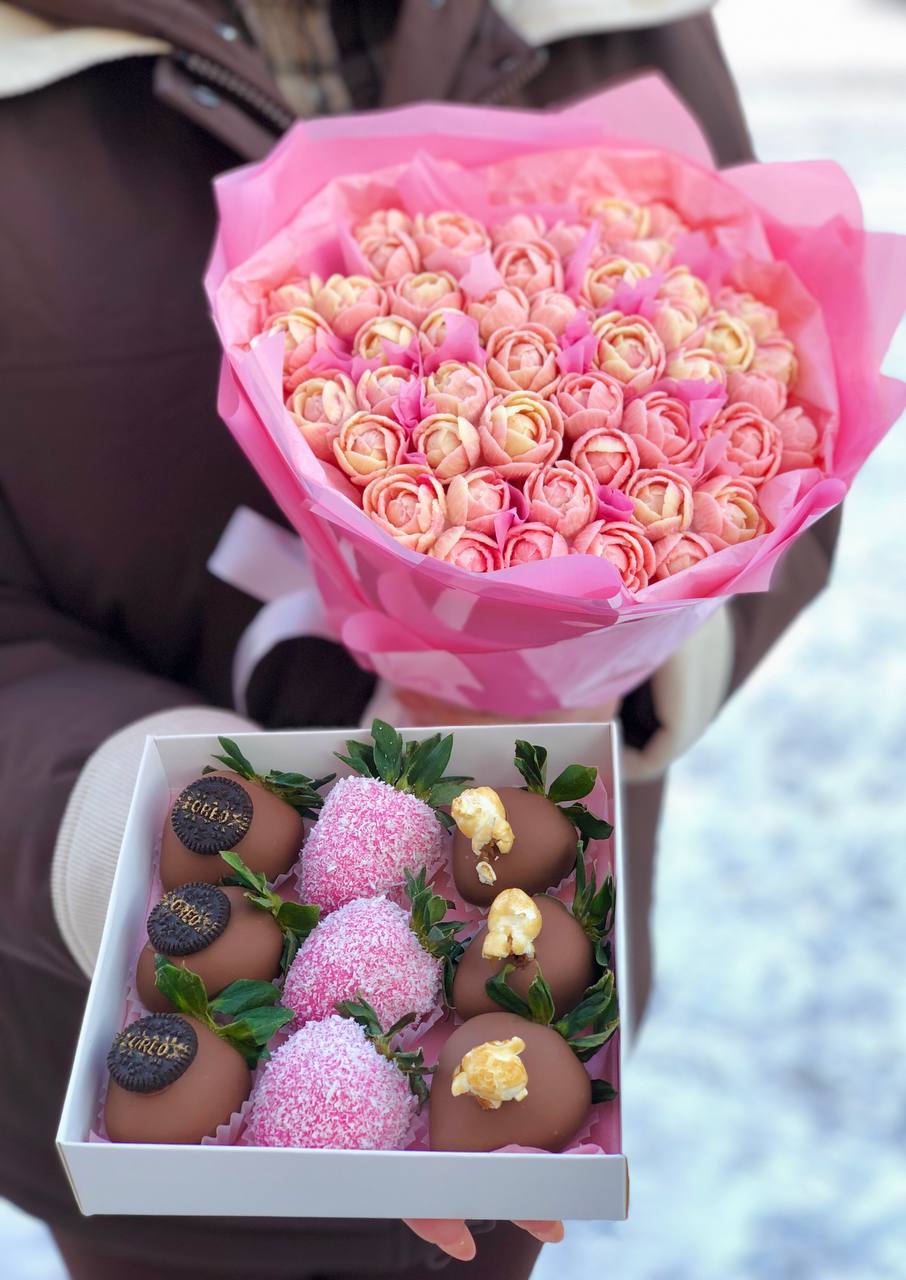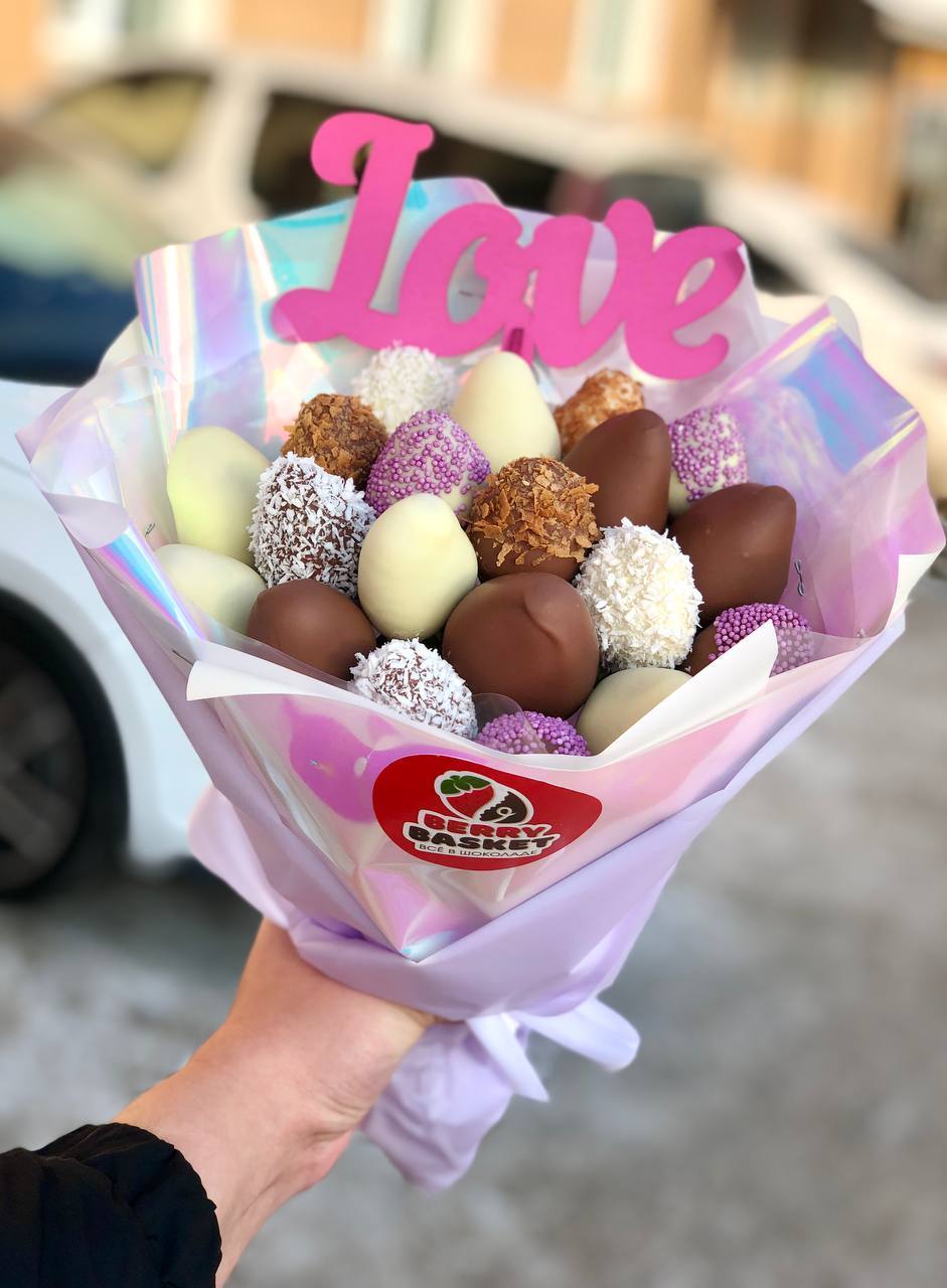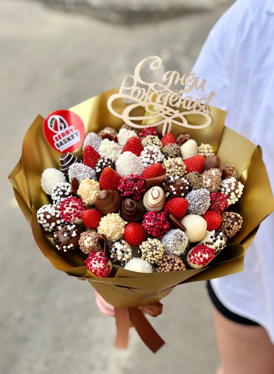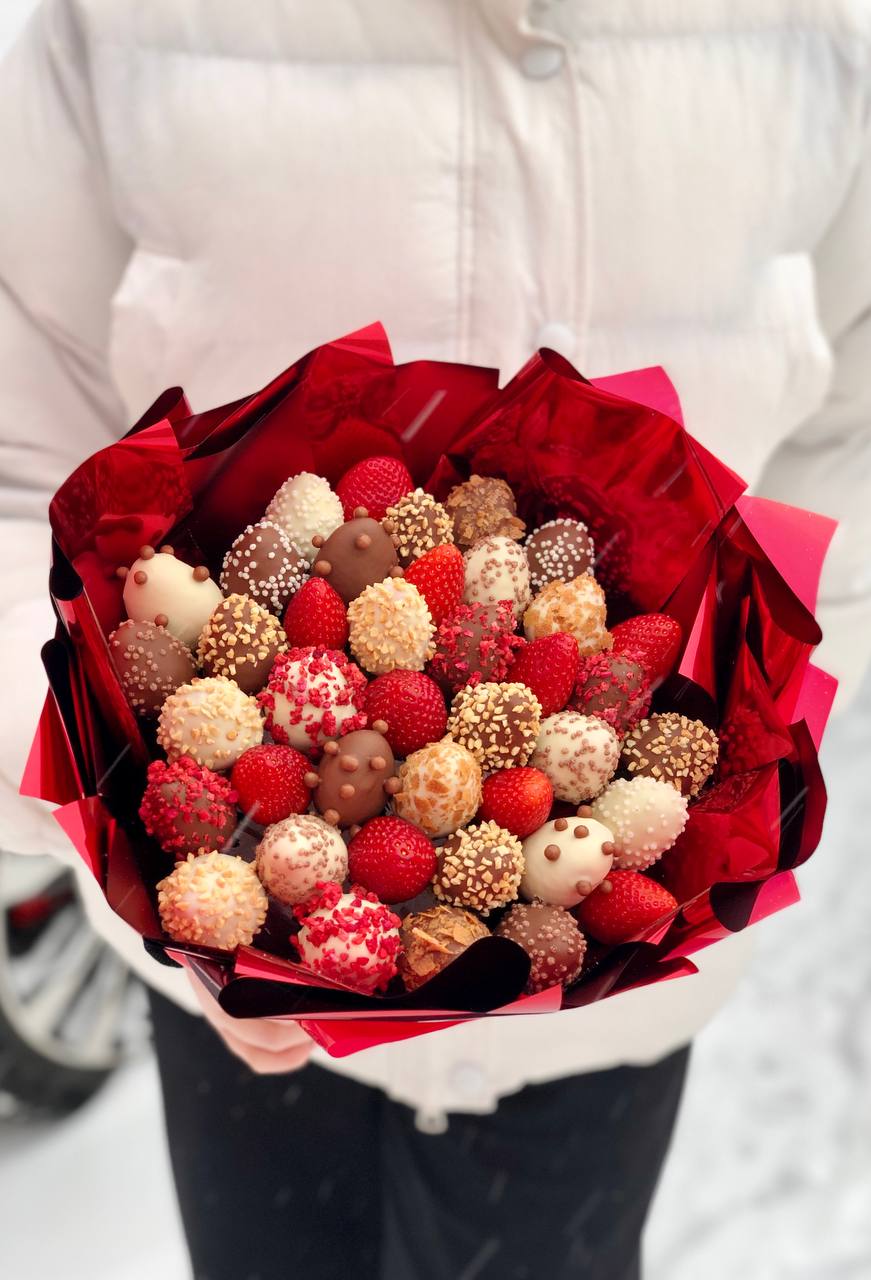 Наши букеты — это свежие ягоды в премиум-шоколаде Callebaut, которые не только вкусные, но и выглядят как настоящее произведение искусства. Качество и стиль в каждой детали.