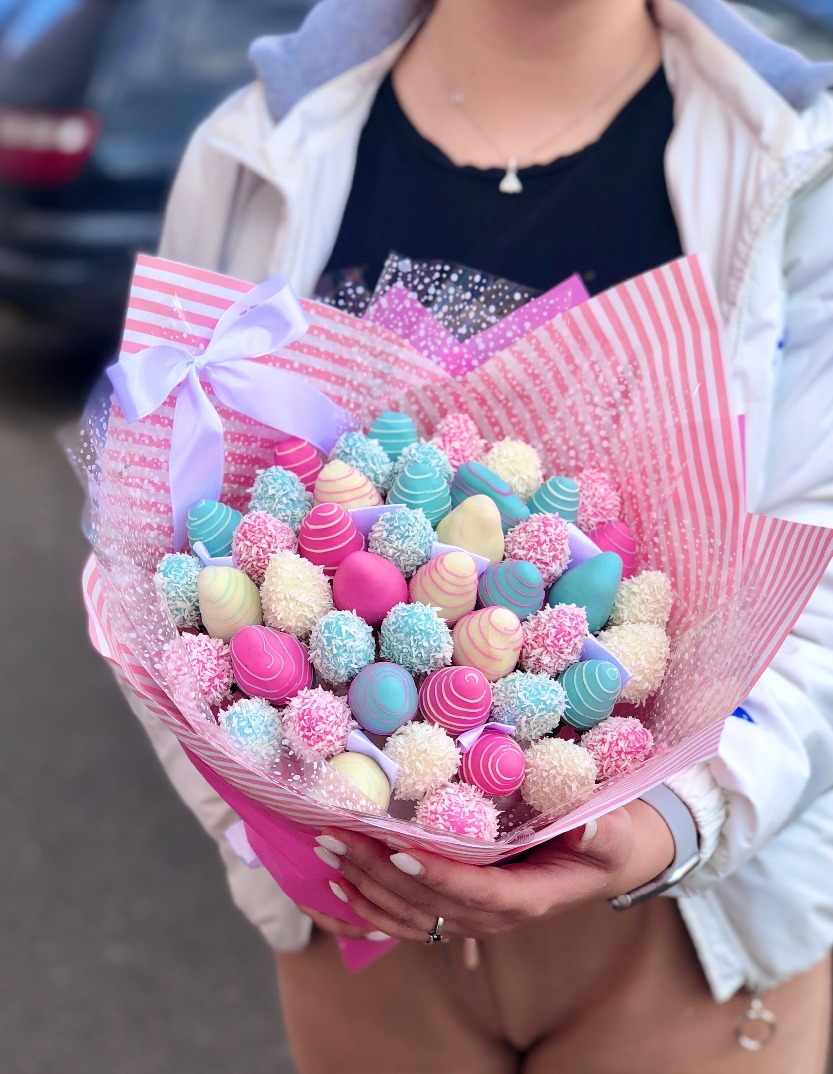 Съедобный букет из клубника в шоколаде Состав: Свежая клубника, Бельгийский шоколад белый, пищевой краситель, воздушный рис, кокосовая стружка.